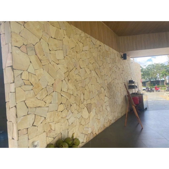Đá rối vàng quay là dòng đá trang trí có màu vàng nhạt được khai thác tại khu vực vùng núi Nghệ An. Bề mặt đá được gia công cắt thô tạo độ phẳng. Phù hợp làm vật liệu trang trí trong nhà như ốp giếng trời, cầu thang, vách ngăn và ốp tường trang trí ngoại thất.